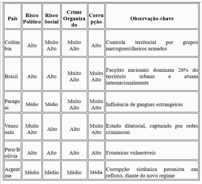 Portanto, no mapa de riscos da América do Sul, esses elementos devem ser considerados como ameaças de médio e longo prazo, capazes de comprometer tanto a estabilidade social quanto a competitividade econômica da região.