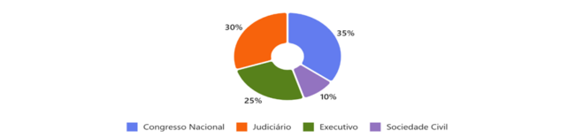 - Sociedade Civil (10%) tem influência limitada, mas pode crescer com mobilizações contra corrupção e violência.