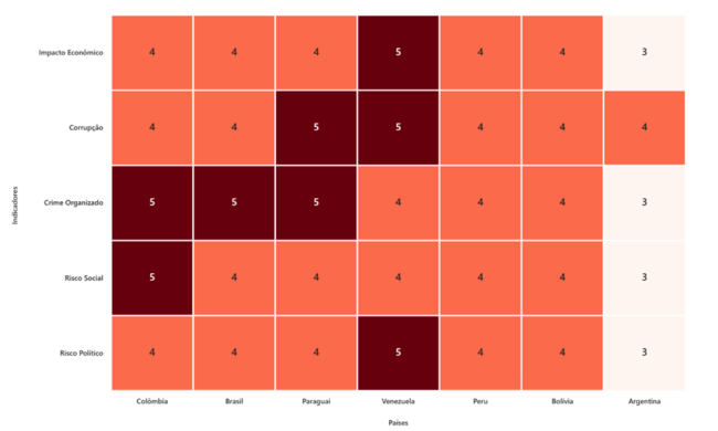 - Peru, Bolívia: Riscos elevados de corrupção e atuação de redes criminosas, principalmente em áreas de fronteira e setores estratégicos.