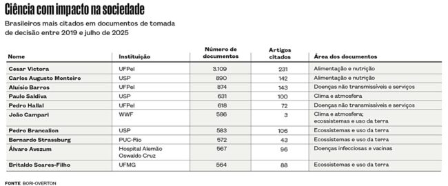 Esses são alguns exemplos de estudos conduzidos por cientistas brasileiros que ajudaram a moldar políticas públicas no Brasil e no mundo. Uma maneira de demonstrar esse impacto é mensurar a frequência com a qual pesquisas são citadas nas referências bibliográficas de documentos de governos, instituições internacionais e do terceiro setor em diversos países. Foi o que fez um relatório publicado em novembro pela Agência Bori em parceria com a plataforma Overton, empresa com sede no Reino Unido especializada em mapear a interface entre ciência e políticas públicas. O levantamento apontou os 107 pesquisadores do país que receberam ao menos 150 citações em 13.742 documentos estratégicos entre 2019 e julho de 2025.